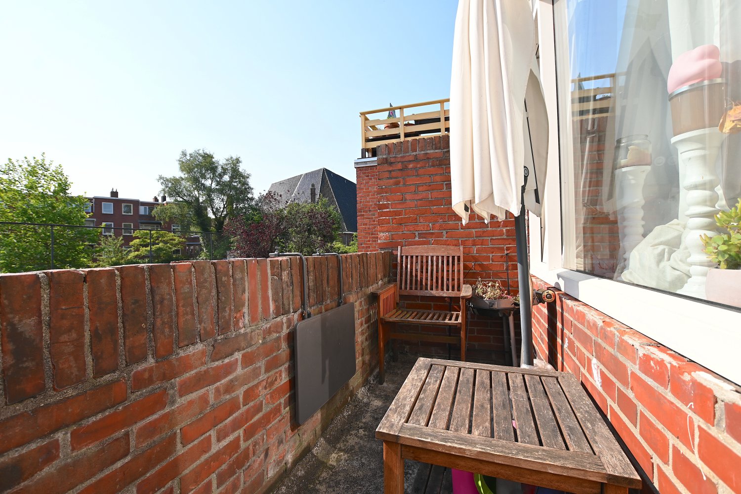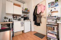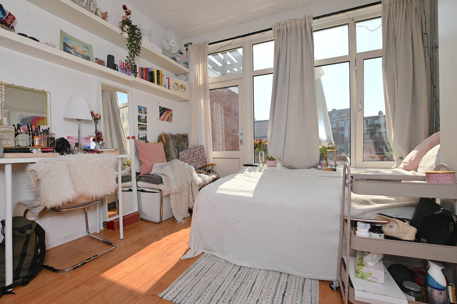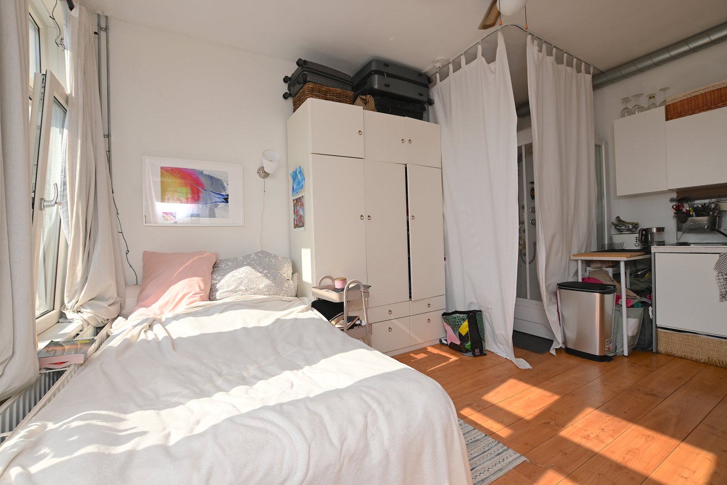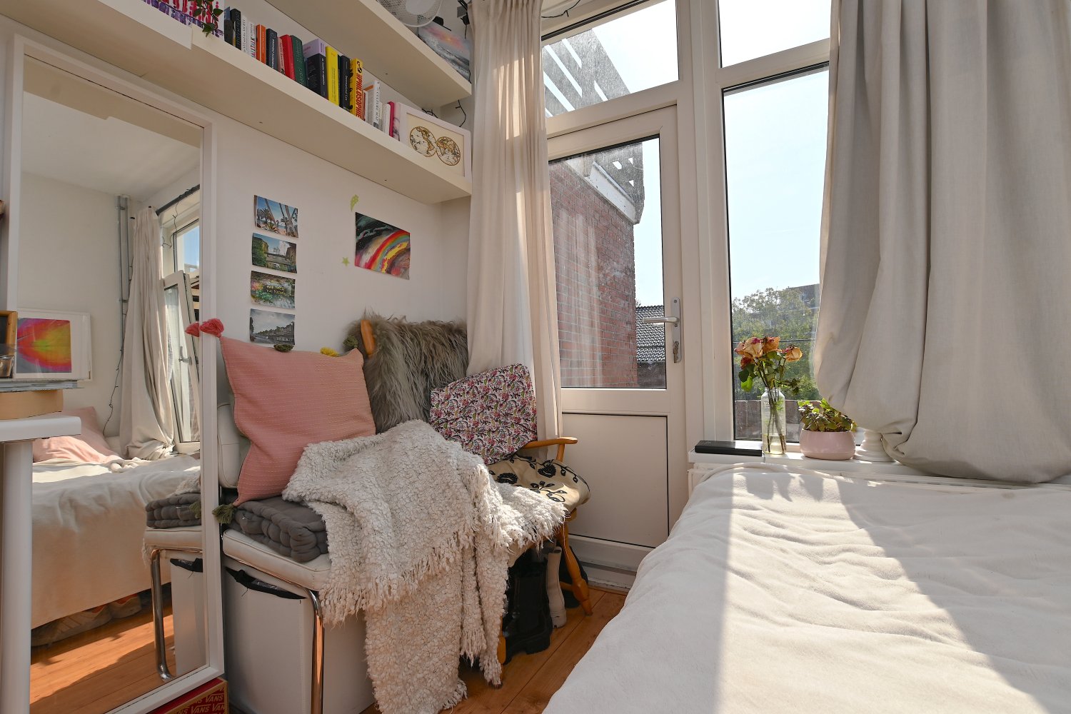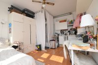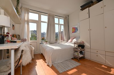De studio is gelegen op de eerste etage aan de achterzijde. De studio beschikt over grote raampartijen waardoor er veel natuurlijk daglicht binnenkomt. Er is een eigen keuken en douche aanwezig en daarnaast beschikt de studio over een eigen balkon waar je zomers heerlijk kan zitten. Enkel het toilet wordt gedeeld met vier medebewoners.