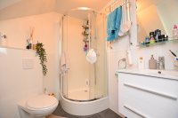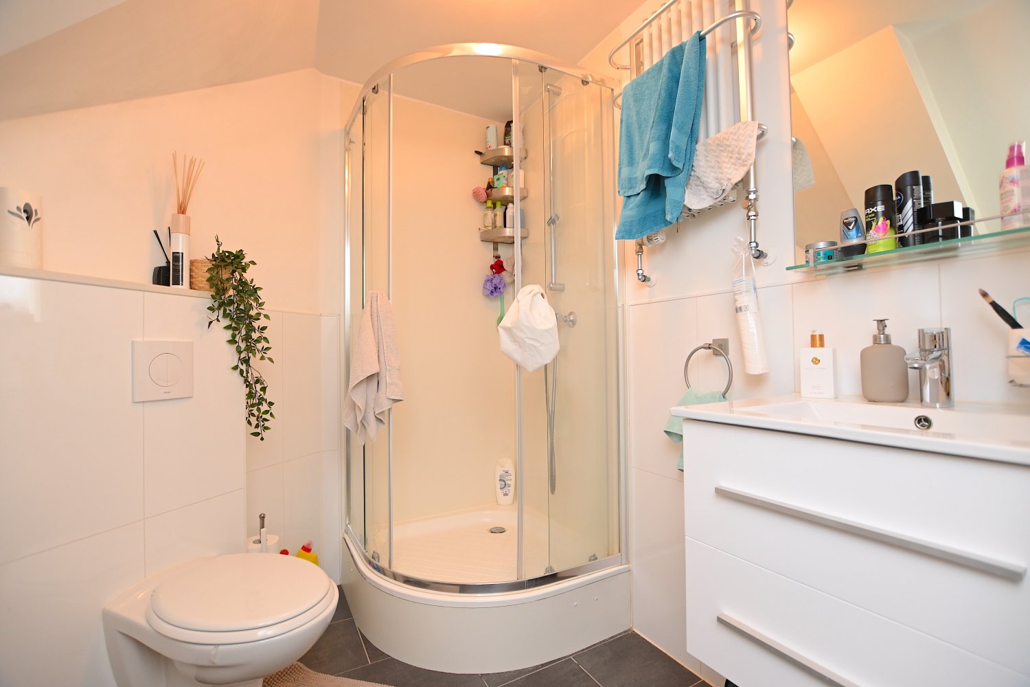 De badkamer is voorzien van een zwevend toilet, luxe wastafelmeubel met spiegel, douchecabine, thermostatische kranen, design radiator, douche rekje, toiletrol houder, handdoekenhouder en het geheel word mooi afgewerkt met een grijze plavuizen vloer.
