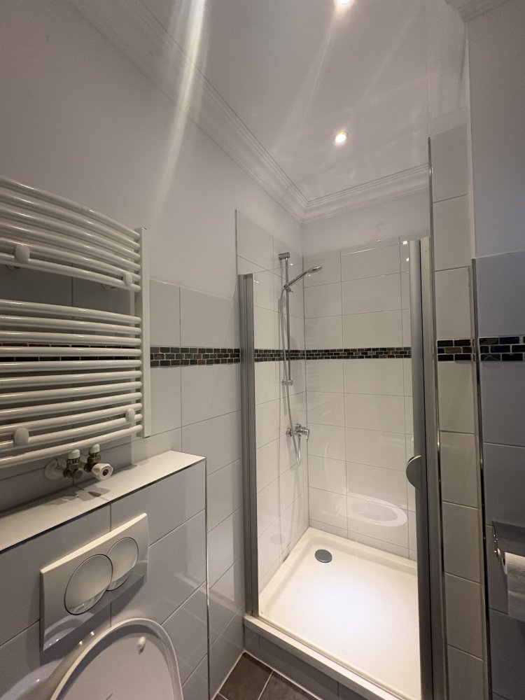 De badkamer zit naast de slaapkamer, en is voorzien van een hangtoilet, douche, design radiator en een wastafel.