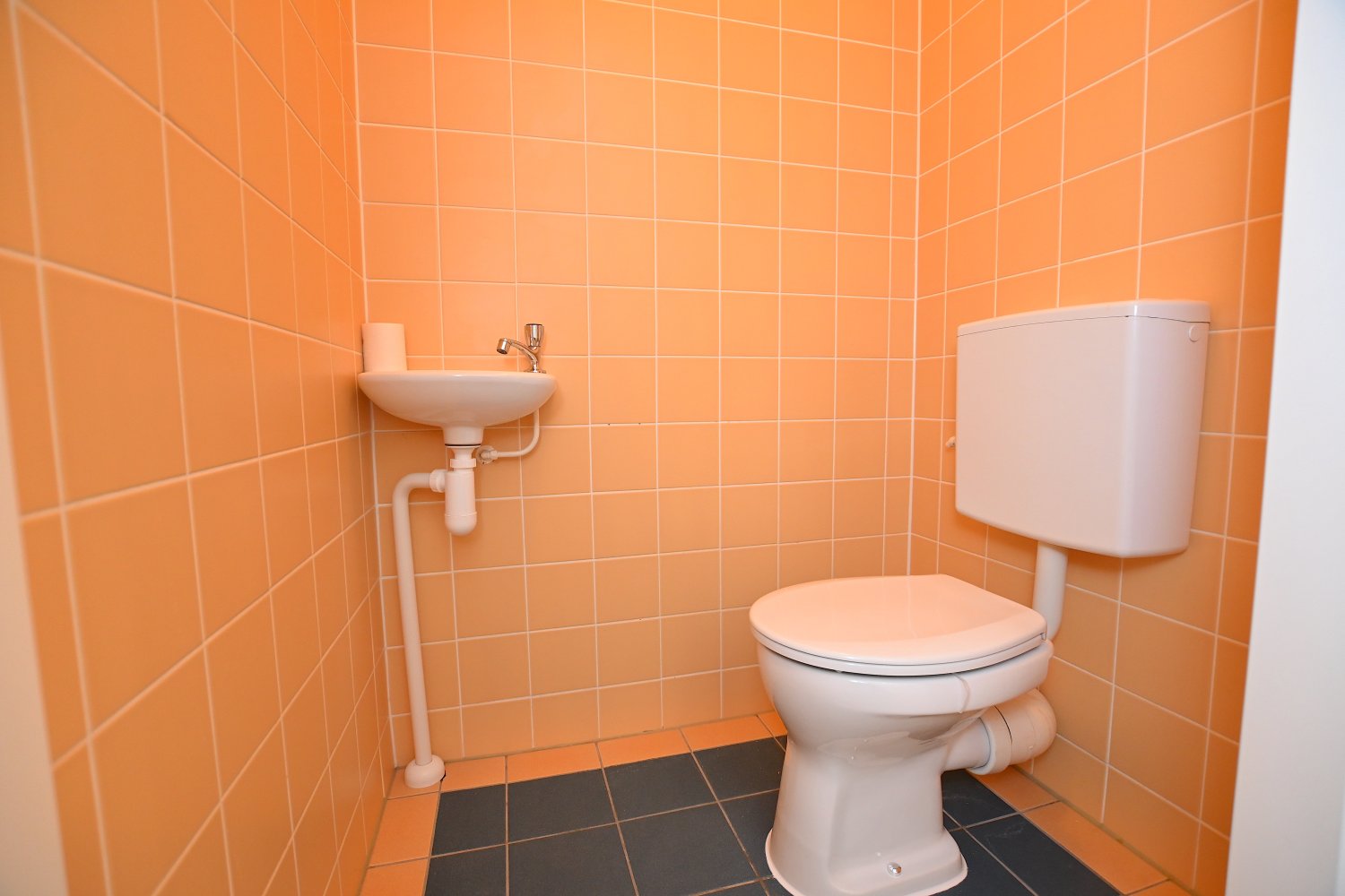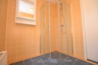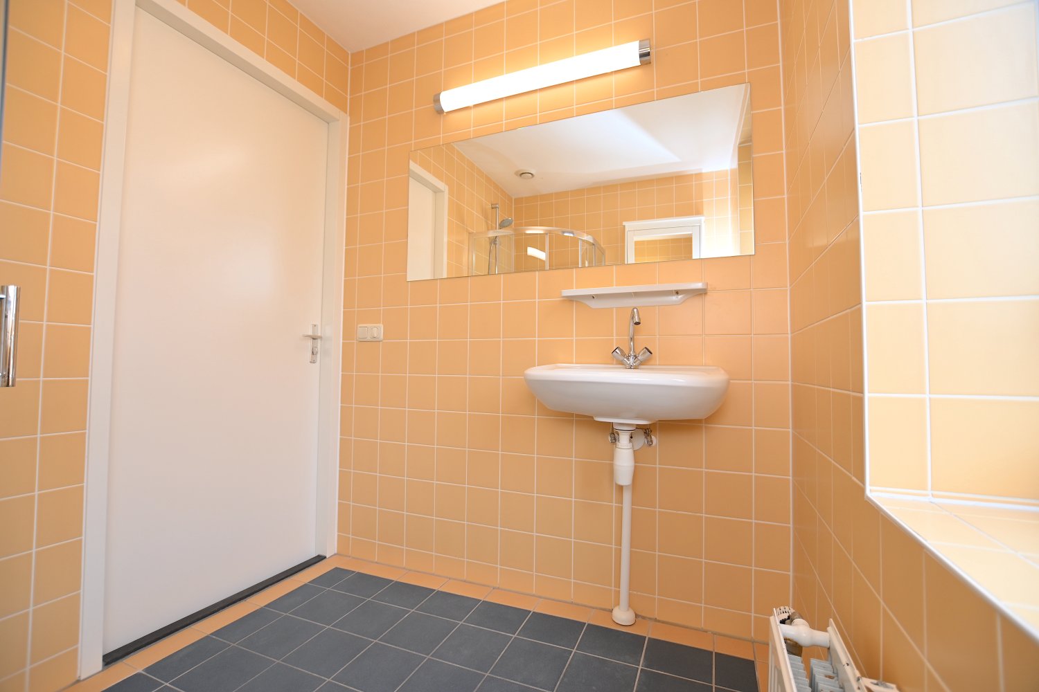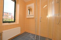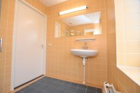 Op de eerste etage is de badkamer te vinden, die is voorzien van een douche, wasbak, spiegel en een badkamermeubel waar eventueel spulletjes in kunnen worden opgeslagen. Het toilet en de badkamer zijn gescheiden van elkaar.