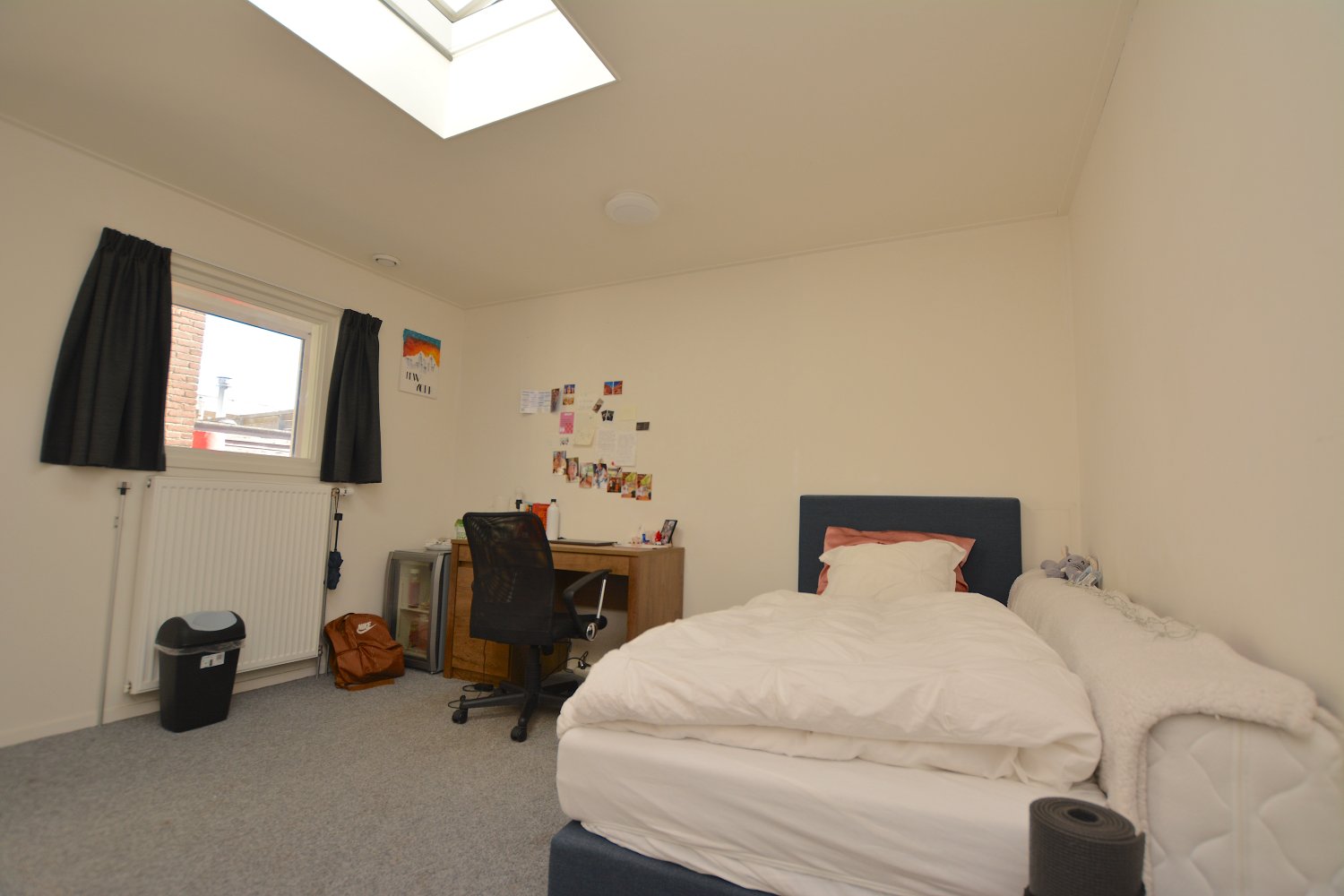 De kamer heeft voldoende plek voor een twee persoons bed, bureau en een kledingkast. Het huis wordt gedeeld met 6 medebewoners. Je deelt hiermee de grote woonkamer van 43m2, de keuken wat beschikt over een vaatwasser, oven, wasbak met kraan, gasfornuis en erg veel werkruimte om je gerechten klaar te maken. Er zijn twee gezamenlijke badkamers aanwezig. Zo beschikt het huis nog over een groot dakterras en een balkon recht tegen over je kamer.